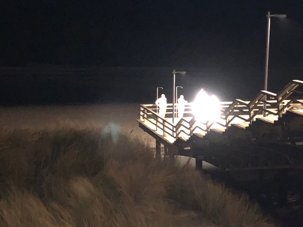 Bei Ebbe fällt das hiesige Sandwatt trocken und der sandige Meeresboden ist so hart, dass man ganz bequem darauf lange Strecken laufen kann. sofern man darauf achtet WOhin man läuft im Dunkeln.