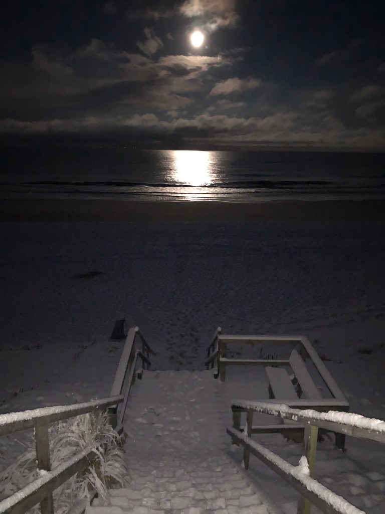 Zwei mit dem gleichen Gedanken. Raus. In den Schnee. Den Strand. Es ist Vollmond und hell. Das Handy schussbereit kommen wir nicht mehr aus dem Wow heraus.