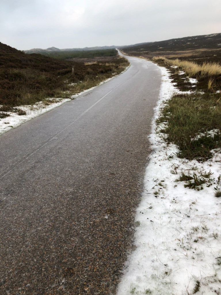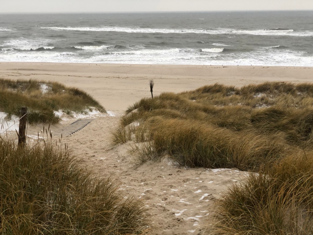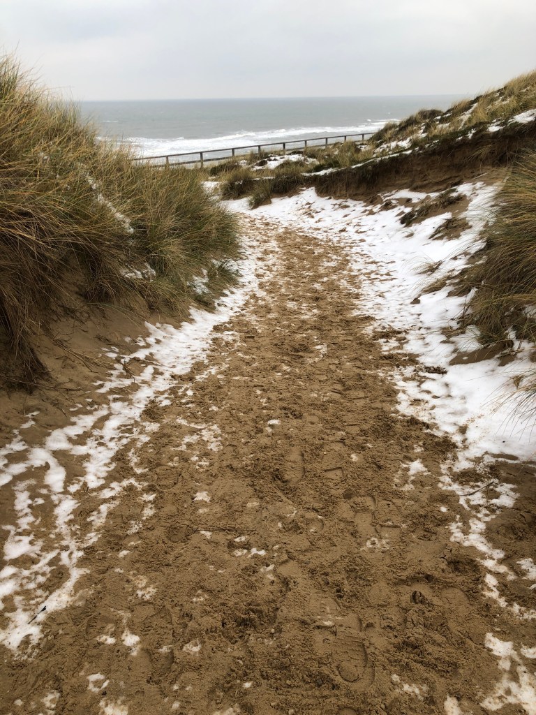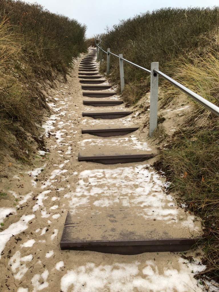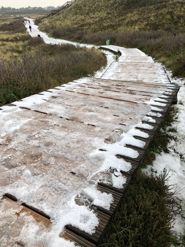 Selbst der Dünenweg ist eisglatt, die einzige Möglichkeit ist, auf der schmalen Grasnarbe am Rand zu laufen, wo das Gras den Schnee vom gefrieren schützte. Meine namhaften Wanderstiefel sind nicht winterfest, das ist schnell klar. Ich komme nur langsam, Schritt für Schritt vorwärts. Eine Wanderung wird das heute nicht, eher ein langer, kalter Spaziergang mit Gehhilfen 😳