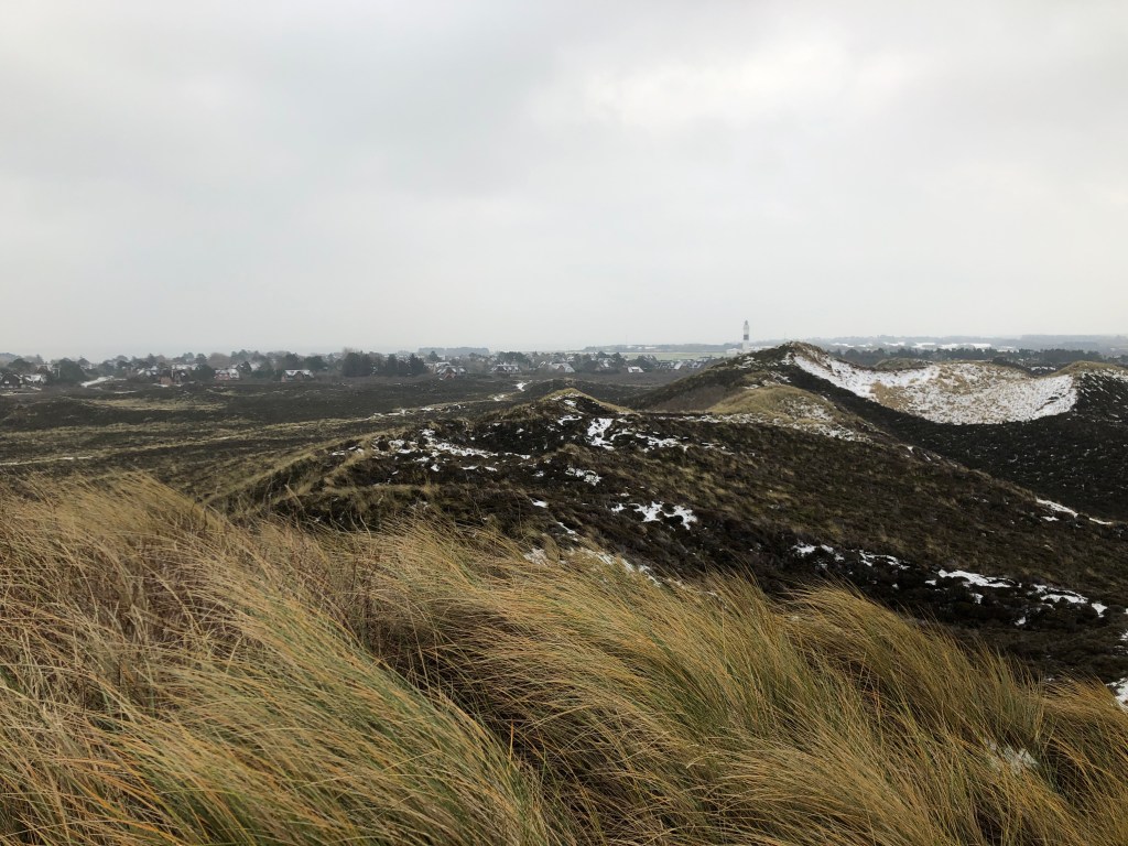 Rechts eröffnet sich mit der Blick auf die Ostseite und das Wattenmeer. Juhu und ein kleiner Farbklecks in der winterlich grauen Dünenlandschaft. An dieser Stelle ist die Insel wieder sehr schmal. Und sogar ein winziger Kiefernwald taucht auf.