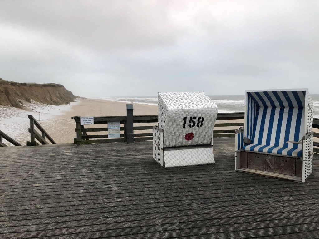 Auf Höhe des roten Kliffs kapituliere ich. Mein rechter Fuß und die Achillessehne schmerzen. Zuviel Belastung. Ich nutze hier den „Ausstieg“. Wäre ich nicht so durchgefroren, ich hätte mir noch ein Viertelstündchen hier im Strandkorb gegönnt. Mit einem Glühwein wäre das durchaus eine Option. Aber auch hier gibt es zu dieser Jahreszeit nichts. Keine Touristen, keine Bewirtung. Die Insel ist im Winterschlaf.