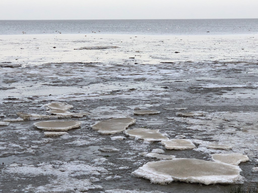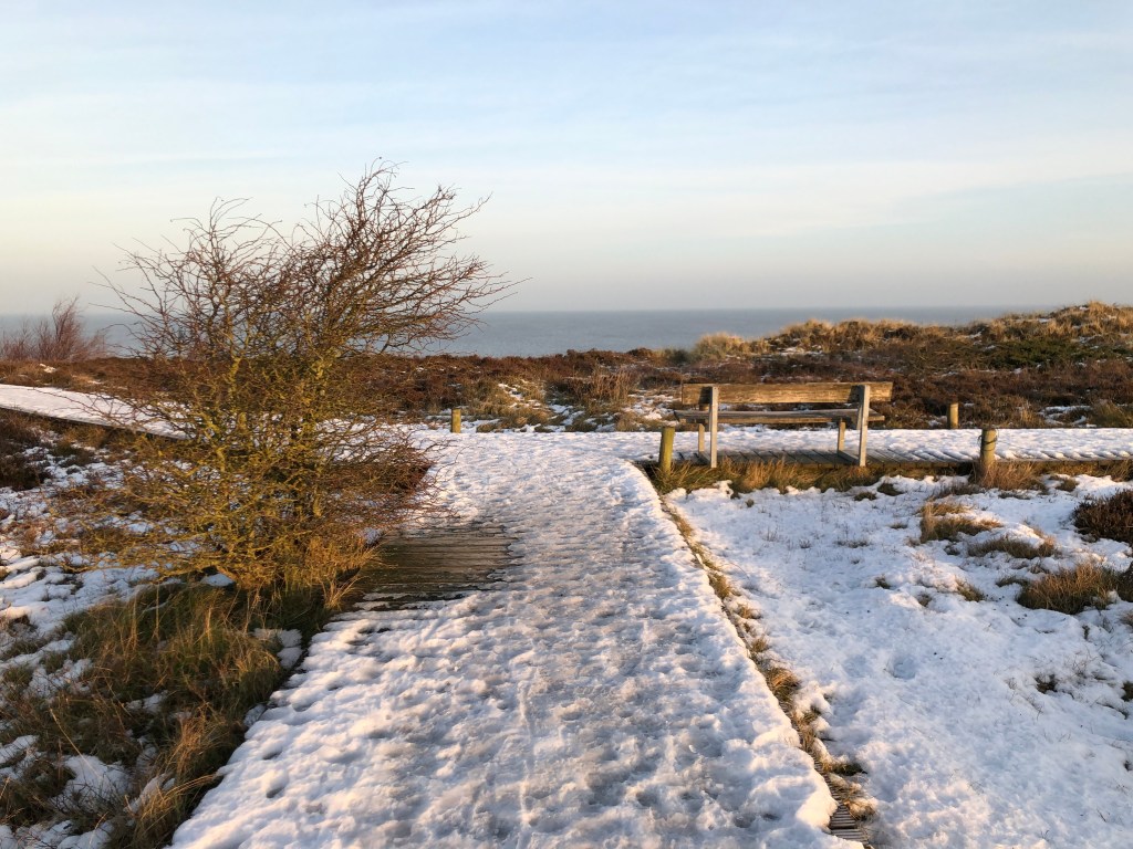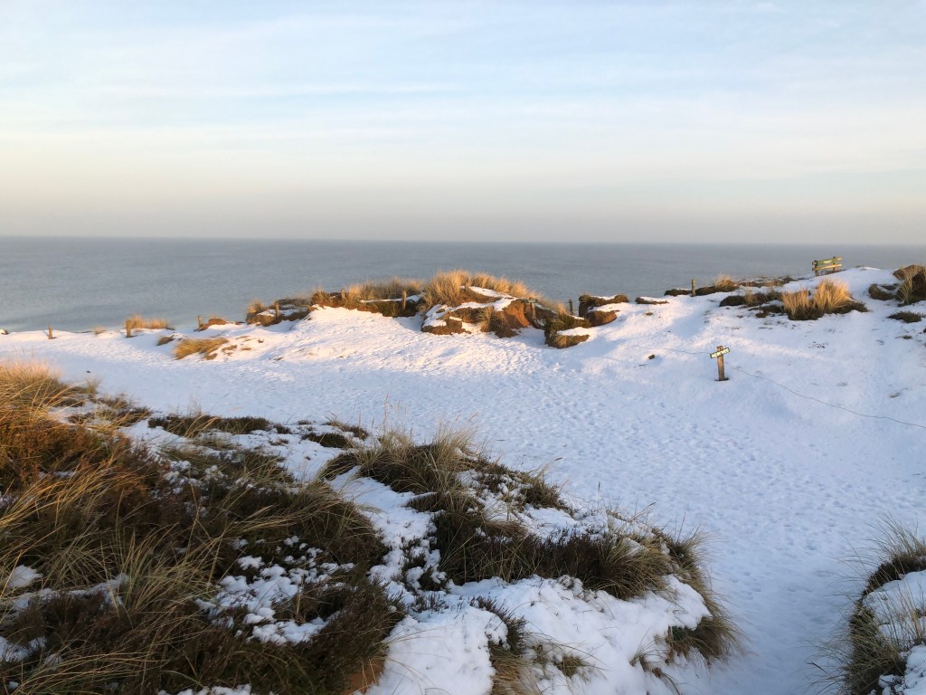 Mein Auto bringt mich nach Morsum auf einen Parkplatz nahe dem Morsumer Kliff. Ich wiederhole mich, aber auch heute befinde ich mich auf einem spiegelglatten Parkplatz und klettere ganz langsam testend aus dem Auto, hangele mich an der Tür entlang zum Kofferraum um an meinen Rucksack zu kommen. Ein einziges Auto aus HH parkt just neben mir. Das Ehepaar holt einen Rollstuhl aus dem Auto. Augenblicklich höre ich auf zu jammern und bin dankbar, auf meinen beiden Beinen laufen zu können. Auch bei Eis und Kälte 🙏