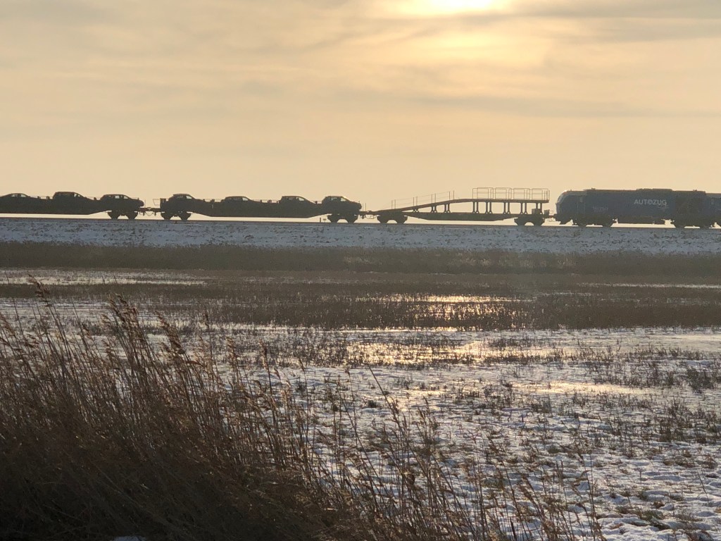 Das Handy griffbereit sehe ich einen schmalen Schatten am Horizont. Jaaaa…tatsächlich…ein Autozug!