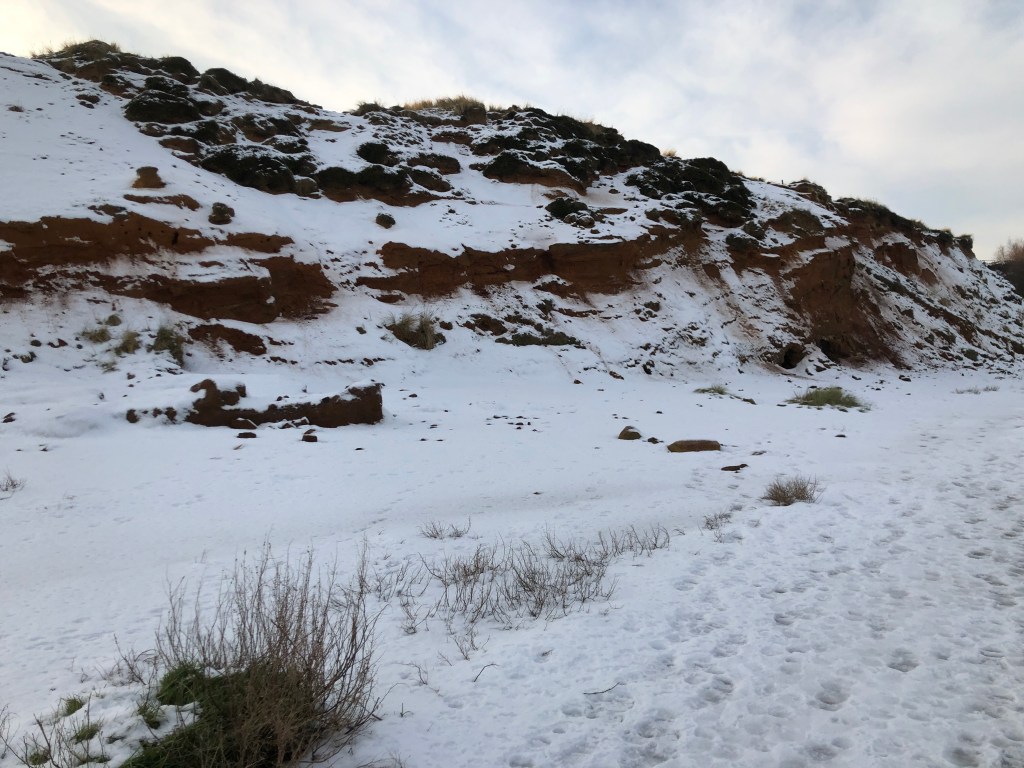 Neben zauberhaften Winterbildern wird mein Blick zu einer eine Million alten Kliffwand gelenkt. durch die eiszeitliche Auffaltung des Bodens entstehen hier Gemälde im Sandstein. Dazwischen Eisgebilde.