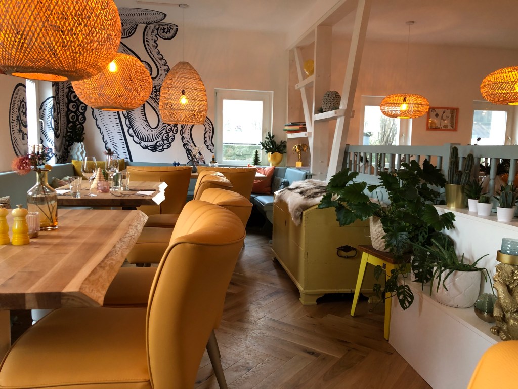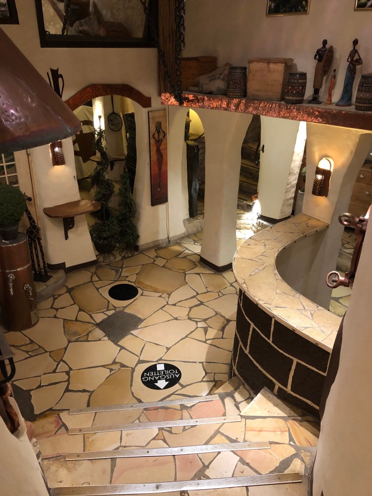 Drinnen ist es urgemütlich, groß, verwinkelt, teils im Keller, teils oben, sehr stilvoll mit vielen künstlerischen und antiken Elementen eingerichtet. Eine kleine Entschädigung für die uncharmante „Anreise“…