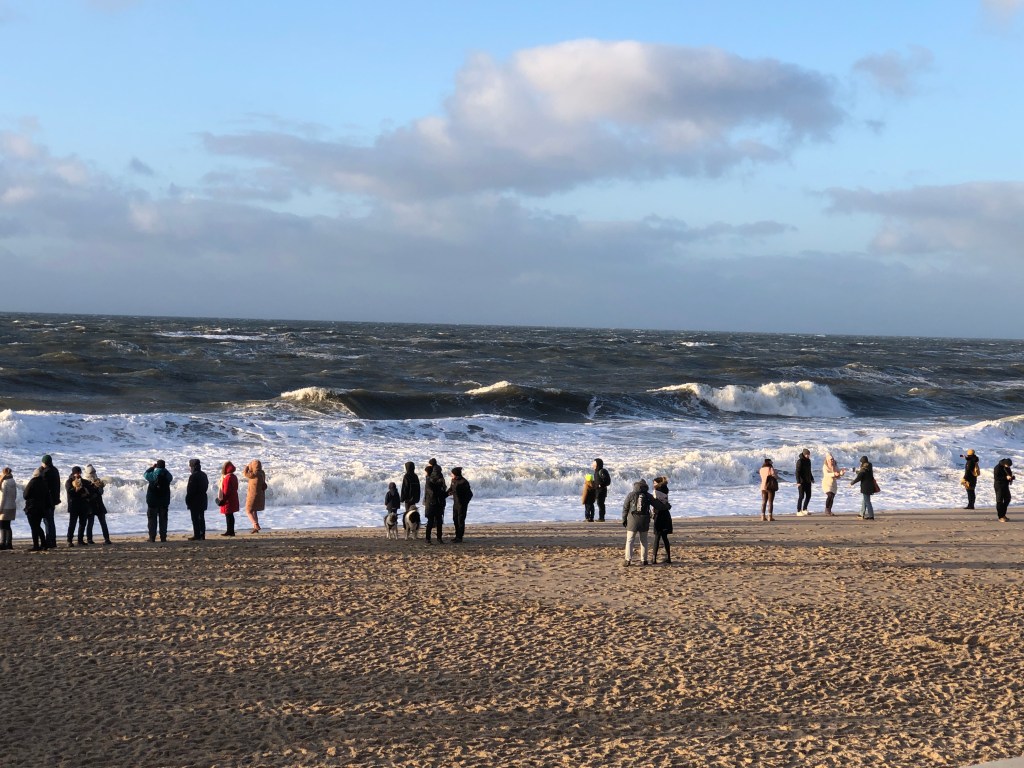 Das Meer ist aufgebracht, die Brandung heftig und überrascht immer wieder die Schaulustigen mit Wellen, die weit auf den Strand hinauflaufen.
