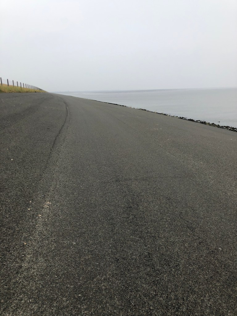 Trotzdem verlasse ich nach einem kurzen Kaffee im Regen in der „Werft-„Lounge die Provinz Groningen, um über die Landgewinnungszone hinüber nach Friesland zu laufen.