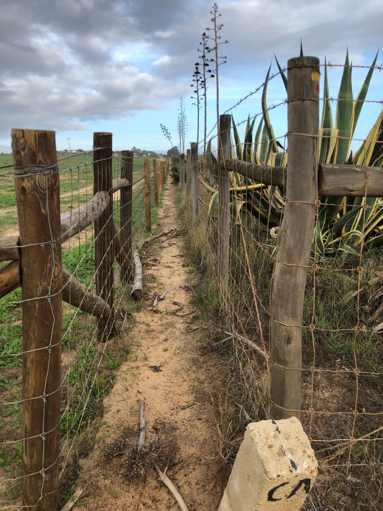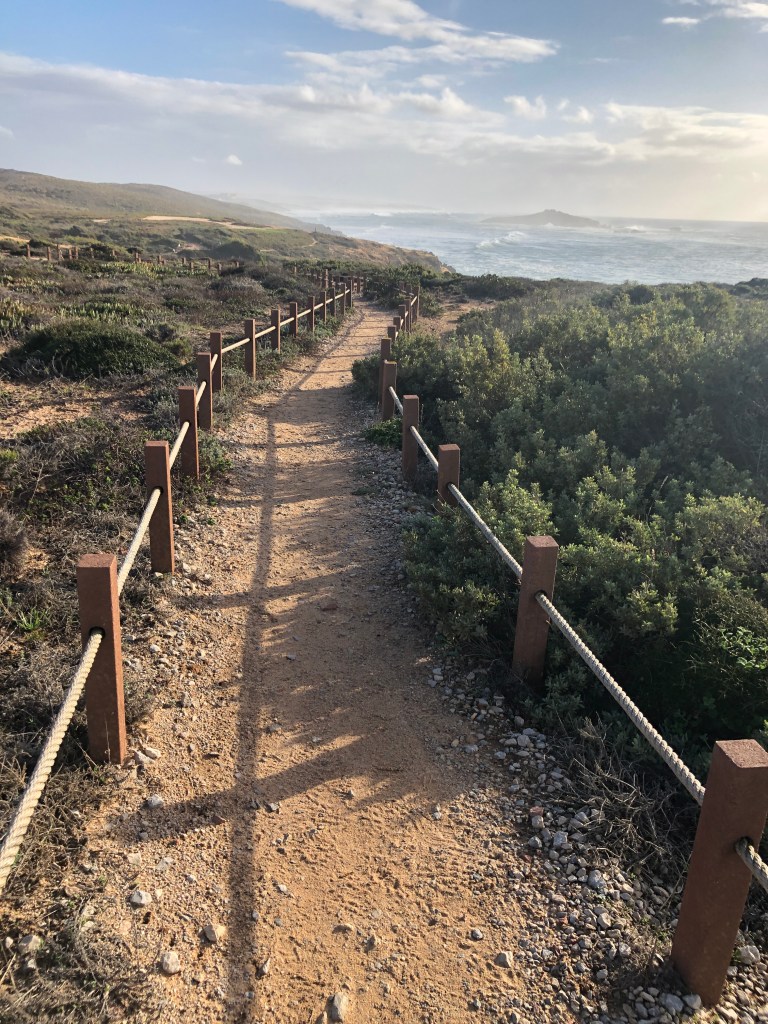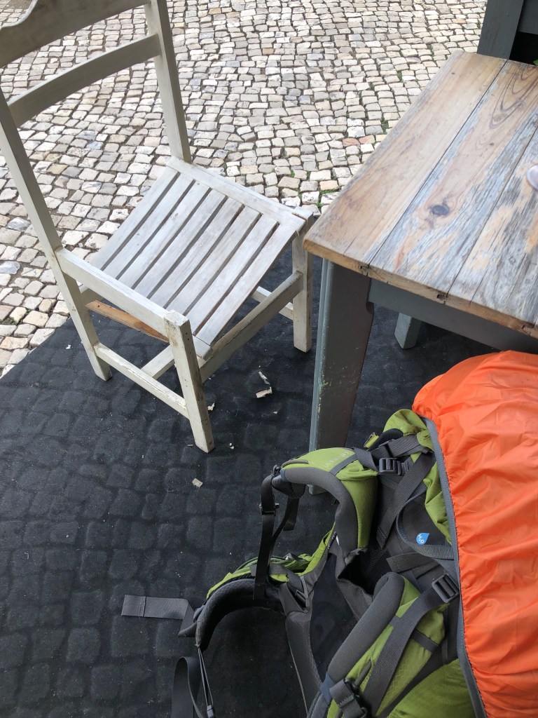 Eine weitere Pilgerin erkennt Gleichgesinnte und bittet um Asyl für ihren MEGA Rucksack. Sie muss was einkaufen. Klar. Unter Pilgern Ehrensache. Wir erfahren sie ist bereits 2,5 Monate unterwegs mit Zelt von Frankreich aus und bereits 2000 km gelaufen. Das Ziel. Ich werde blass. Sagres. Erstmal. Respekt.