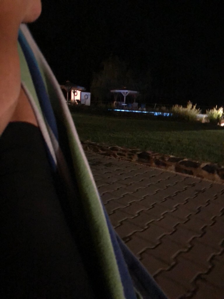 Ich campiere in einer Ferienanlage ziemlich außerhalb. Allein, vermute ich. Self-CheckIn wie heute üblich. Es ist alles dunkel. Mein Apartment liegt direkt am Pool.