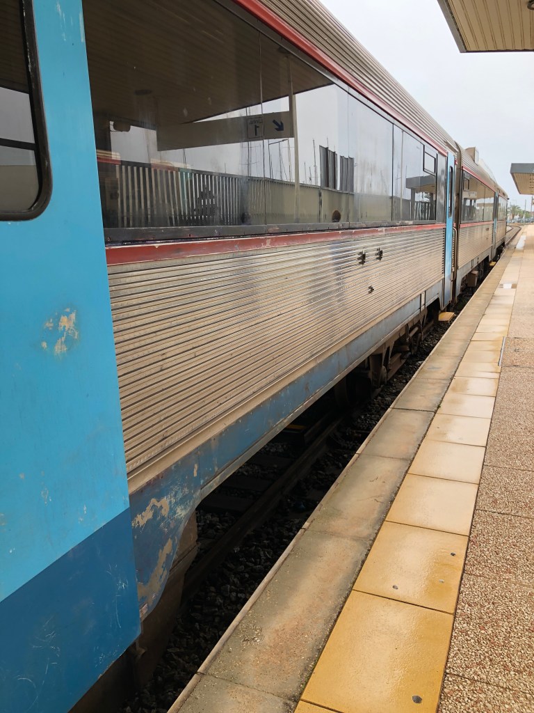 Am Morgen verlasse ich Lagos in Richtung Bahnhof. Was soll ich sagen. Es regnet und ist nebelverhangen kühl. Das Bad im Rooftop-Pool fällt also auch aus. Die Stimmung gerade ziemlich mies. Die beiden Blasen schmerzen bei jedem Schritt. Trotz der gestern noch gekauften Ultra Compeed Pflaster. Also fahre ich mit einem Antikzug nach Albufeira.