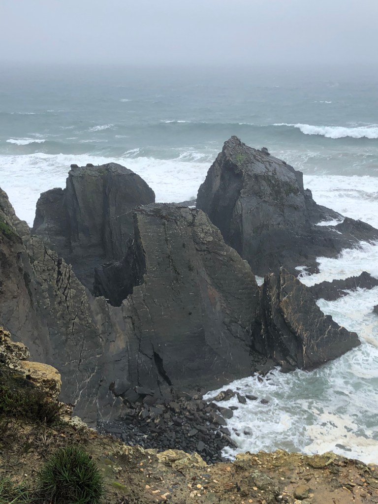 Ich bleibe verschont, aber es regnet unaufhörlich und ich stapfe gesenkten Hauptes den Sand-, pardon Matschpfad entlang. Das Handy ist trocken unter dem Shirt verstaut. Die ersten 3 km müssen scheue Blicke nach rechts zum Antlantik genügen.