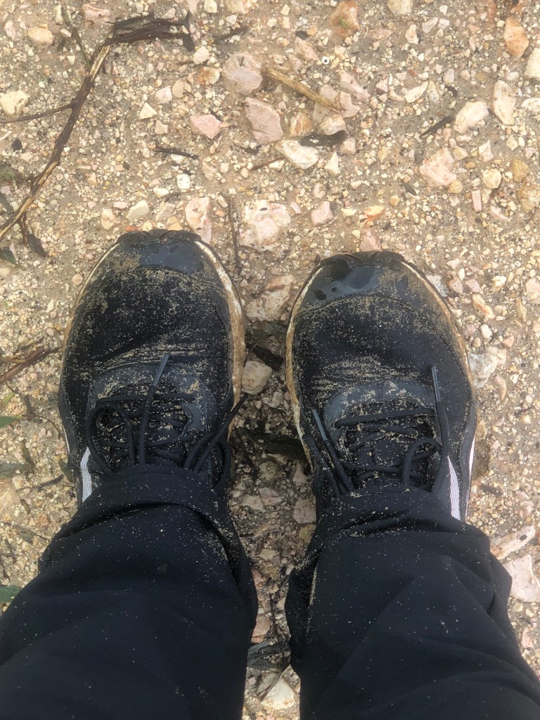 Meine Hose hängt schwer und triefend über den matschigen Schuhen. Wenigstens der Wind fängt langsam an, mich wieder trocken zu blasen.
