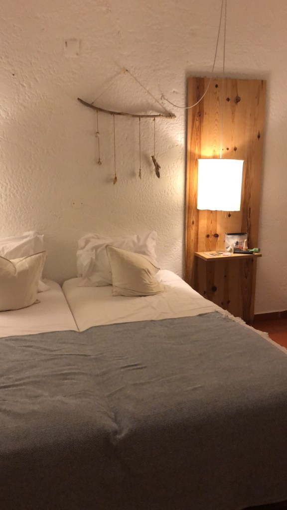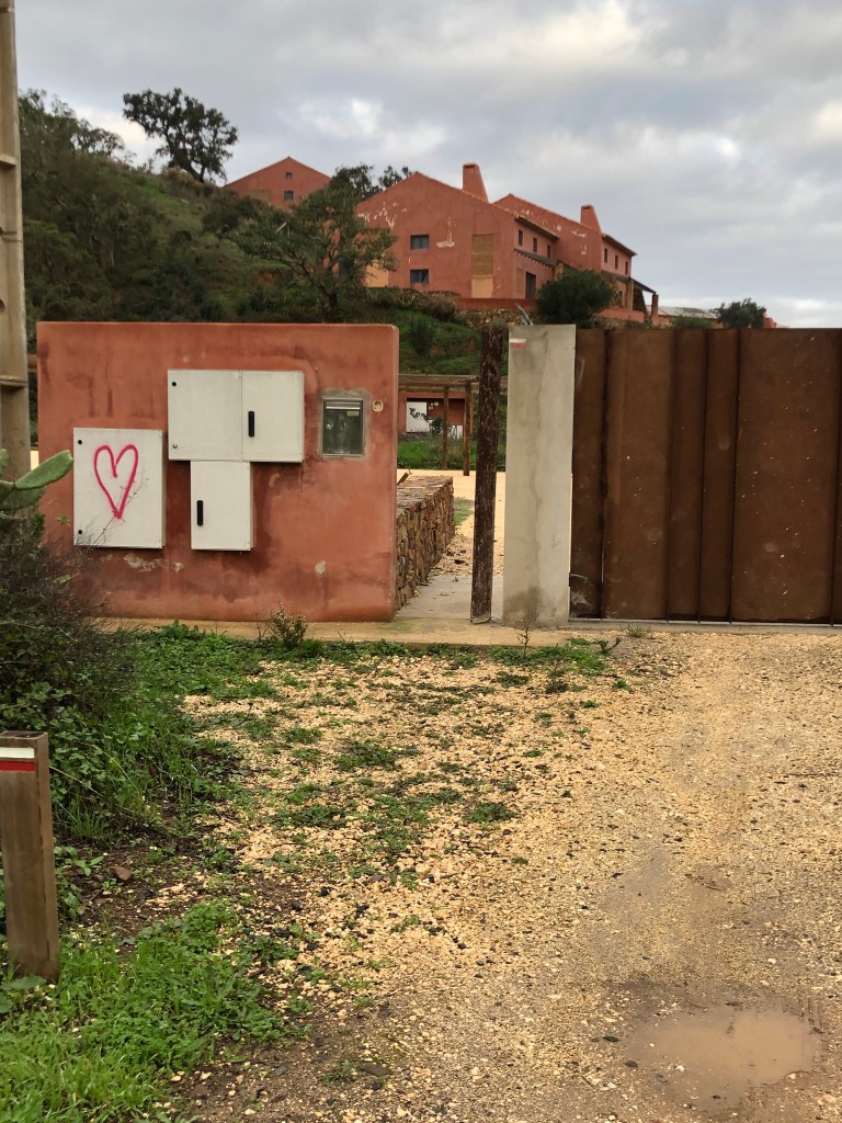 Gott sei Dank bin ich richtig. Hier gibt es eine spektakuläre Anlage, aus dem roten Gestein von gestern. Aber sie scheint aktuell unbewohnt. Es ist aber neben Pools und Photovoltaik alles da. Man darf hindurch gehen 😉