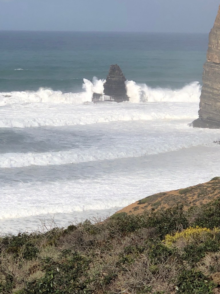 Mich nun trennten ein Fluss von Carrapateira. Der offizielle Weg – keine Ahnung. Google Maps sagt bis zur Brücke außen herum. Moment. Das hatte ich schon mal! Never. Flussüberquerung? Ja. Heute auf jeden Fall. Er ist hier auch noch schmal und bewachsen. Ich schlage mich durchs Gestrüpp und siehe da….