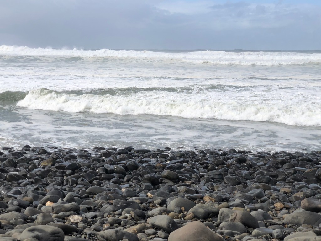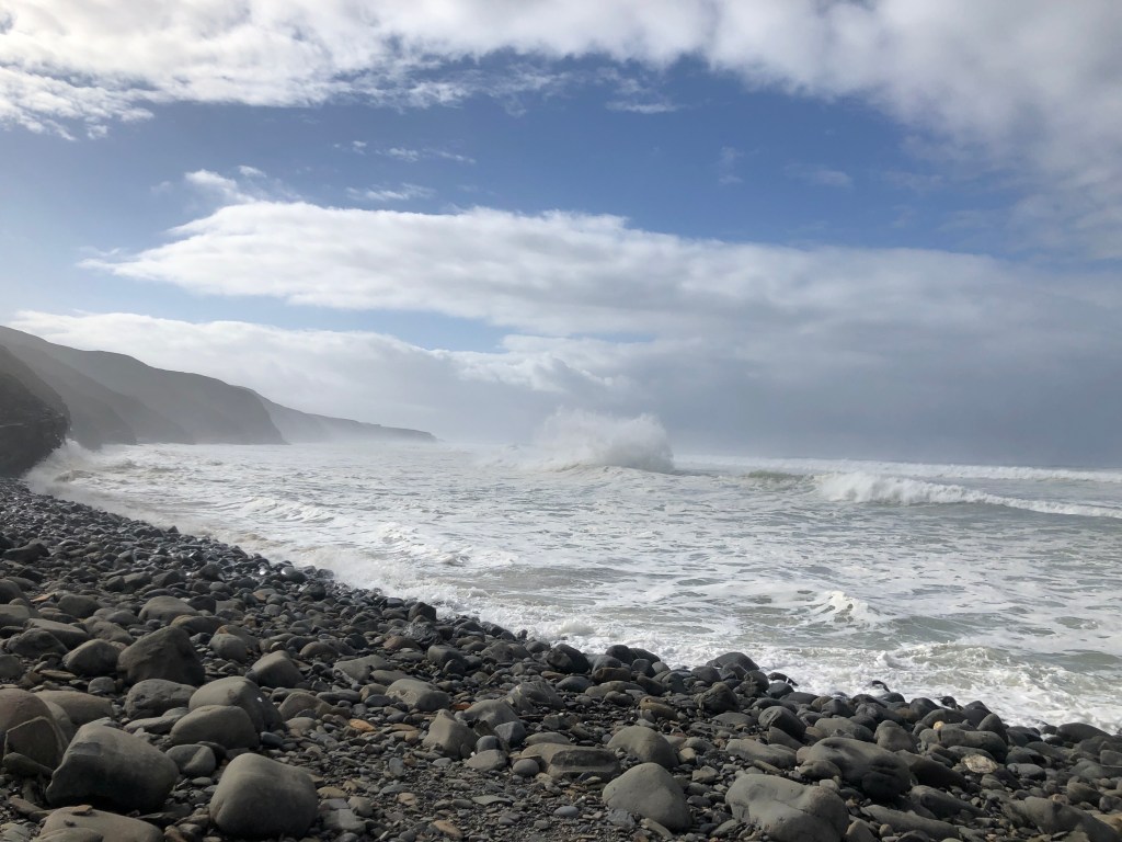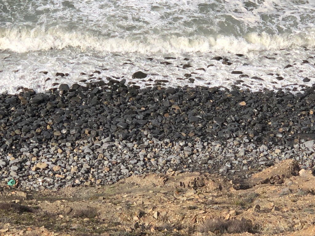 Mir schwant schon. Es wird auch wieder bergab gehen. Richtig. Aber zu meiner Überraschung zu einer Bucht, die mich gefangen hält, so beeindruckend ist hier die Brandung.