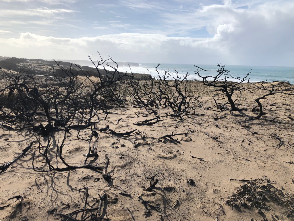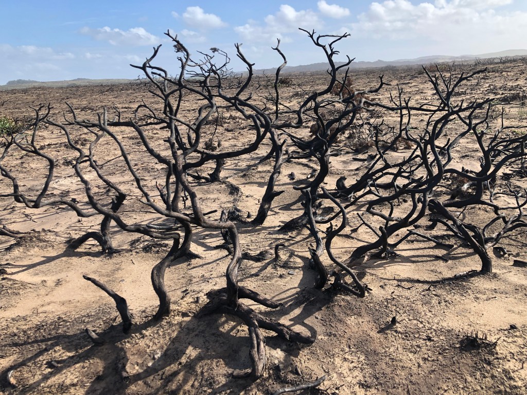 Was ich fast vergessen hätte. Hier tobten dieses Jahr Brände, die alles verbrannten. Totale Verwüstung. Ein Bild wie auf einem anderen Planeten..
