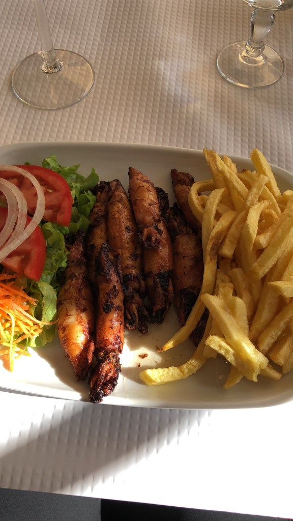 Zum späten Frühstück (es ist 14:00 Uhr) gibt es gegrillte Baby-Calamari und ein Glas kalten Weißwein. Die Welt ist wieder in Ordnung und den Fuß habe ich fast schon vergessen.