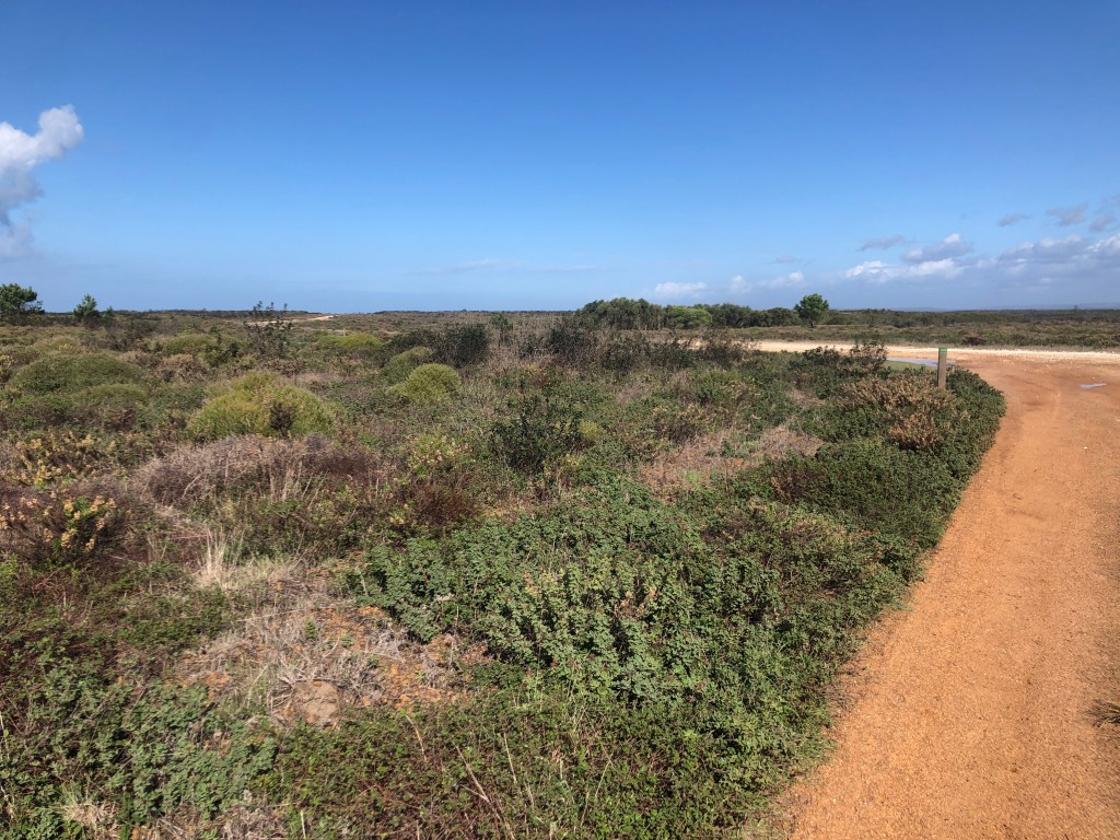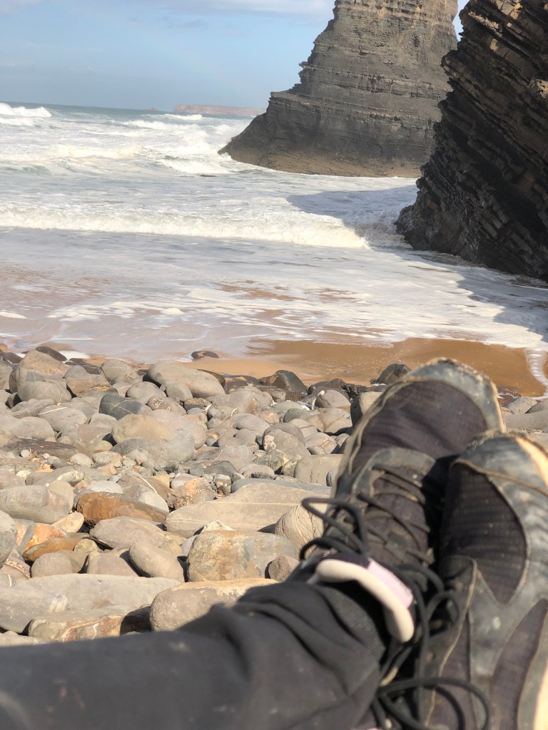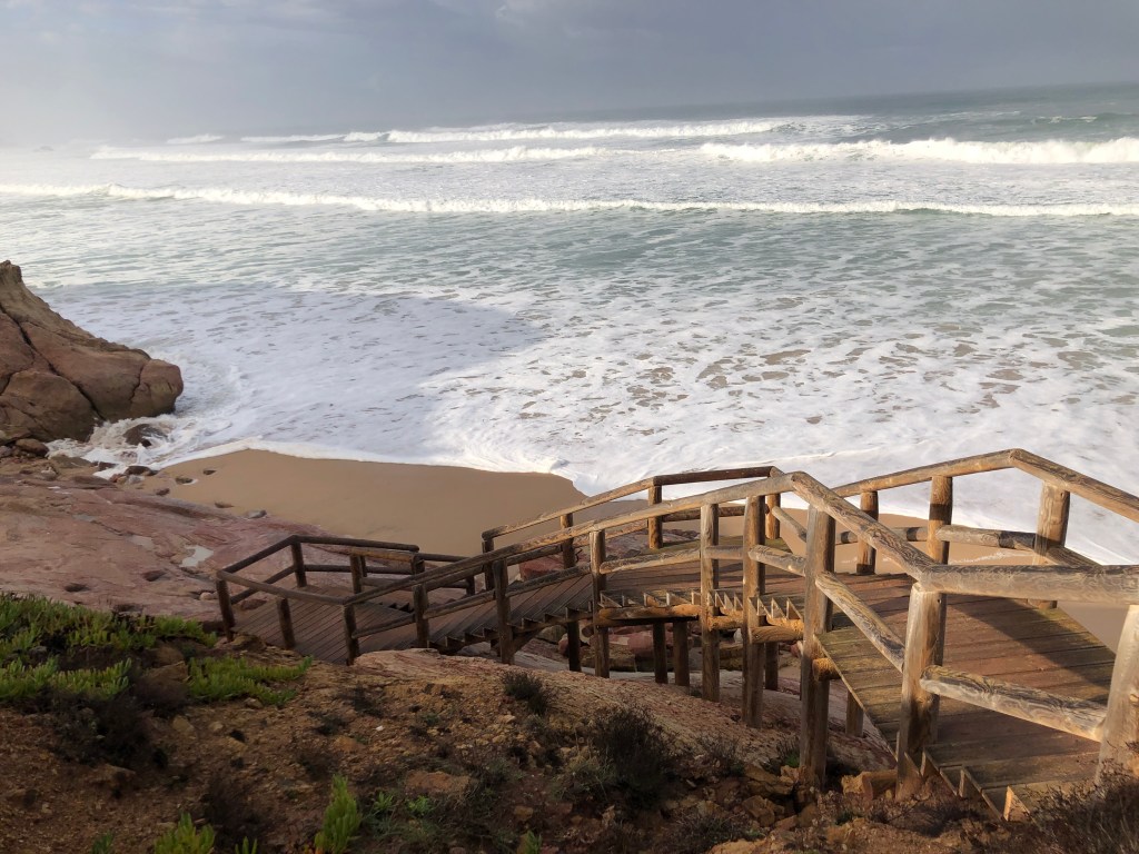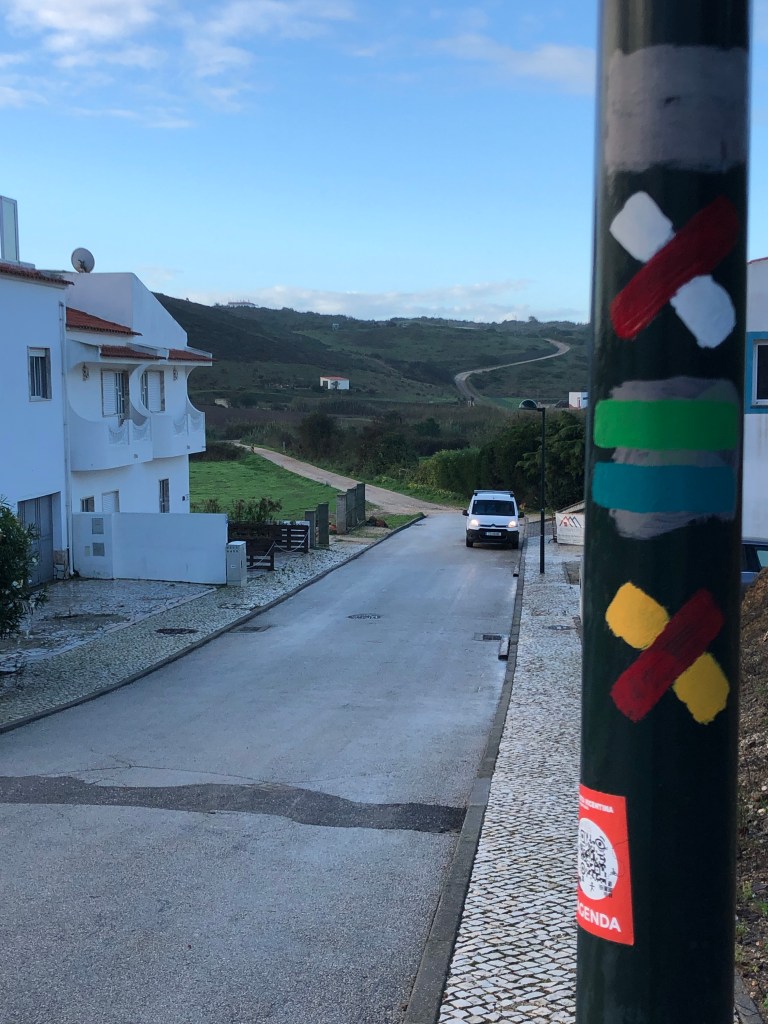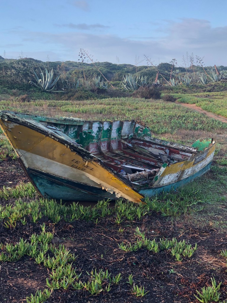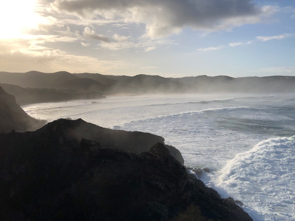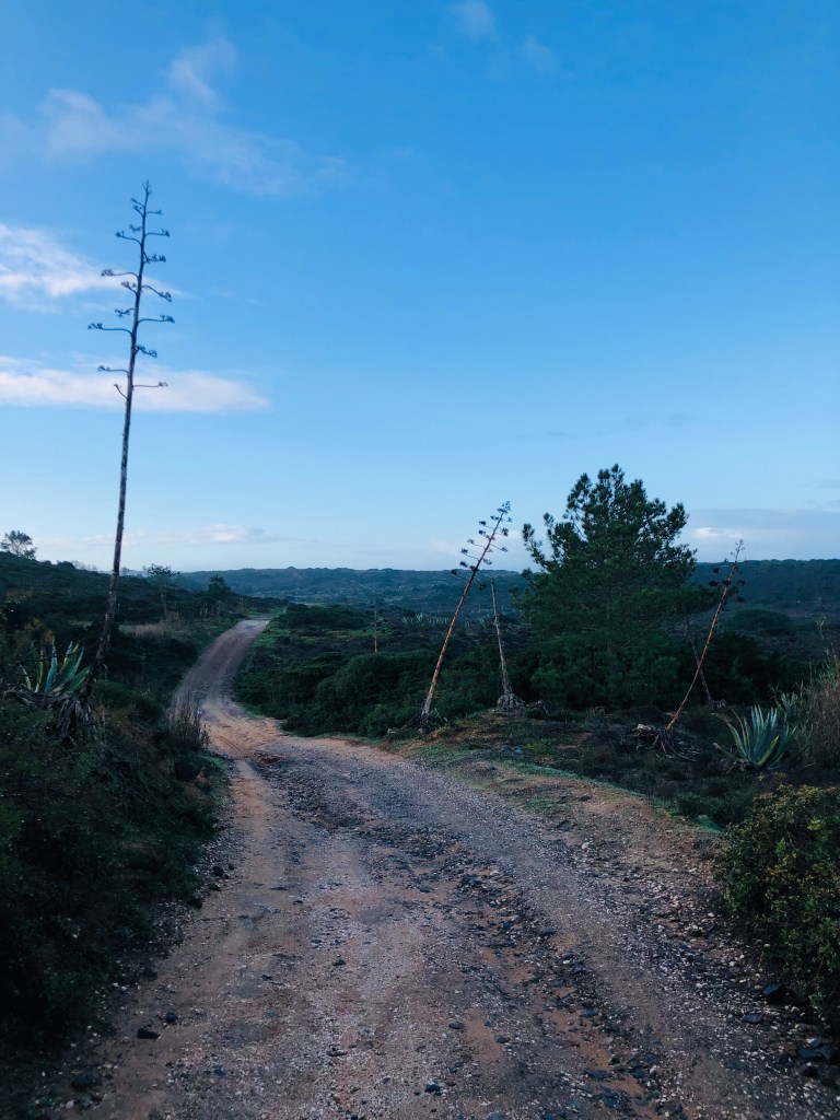 Heute Morgen bin ich früh wach, wie immer. Es regnet. Warum auch nicht ? Bis hier irgendeine Bar oder Café oder Minimercado aufmacht habe ich keine Geduld. Im Ruckssck finde ich noch ein zerquetschtes Mars (…Macht bekanntlich mobil bei Arbeit, Sport und Spiel 😅) und einen Apfel, na bitte. Am nächsten Strandabschnitt soll eine Bar sein, offensichtlich auch offen. Also ziehe ich gegen 8 Uhr, nach dem der Regenschutt vorbei ist, los in Richtung Küste aus Carrapateira heraus.