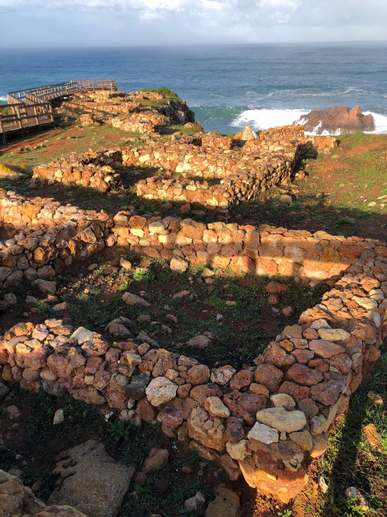 Nach etwa 1,2 km erreiche ich die Küste und Ruinen einer Besiedlung um etwa 12. JH. Mitten auf einem Felsen. Die Aussicht und der Atlantik im Morgenlicht ist gigantisch. Wieder einmal kann ich mich nicht losreißen.