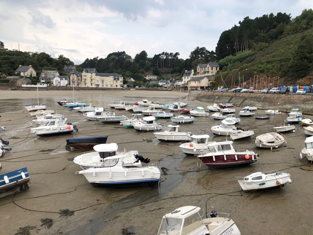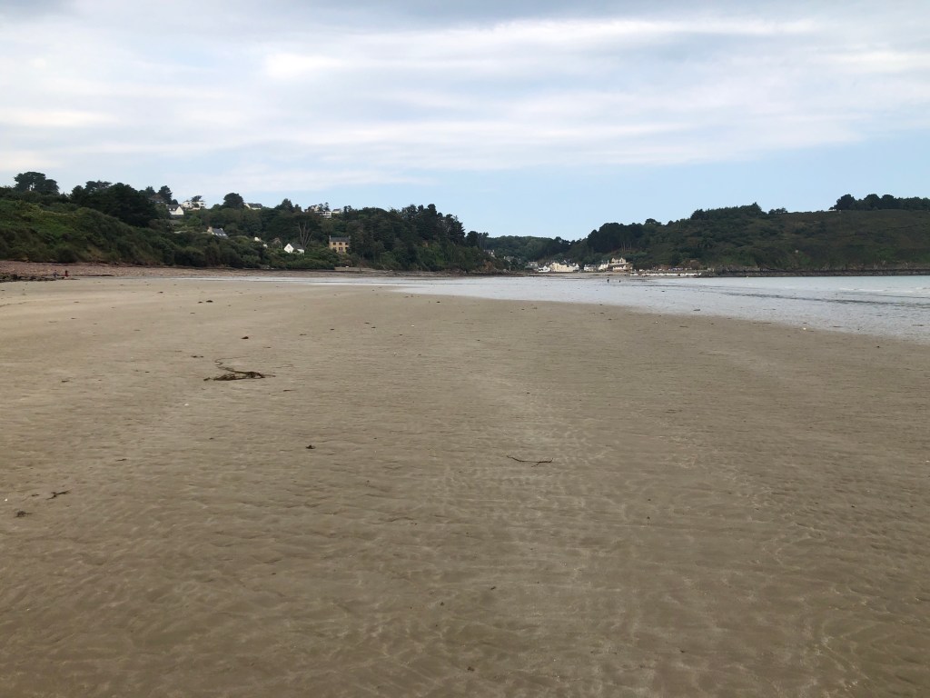 Ein Highlight gibt es heute dennoch: es ist Ebbe, das Meer zieht sich gerade zurück und als Brehec in mein Blickfeld kommt, sehe ich heute auch die Chance eine Abkürzung über den freigelegten Meeresboden zu nehmen. Erst einmal Klettern über große Steine vorbei an von der Brandung ausgewaschenen kleinen Höhlen und dann zielstrebig auf das Hafenörtchen zu. Perfekt. Und ich spare einen Umweg um den Strand und bleibe somit unter 20 mit 18,5 😆