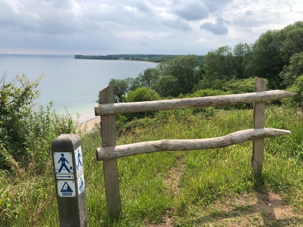 Ein Wegweiser macht mich darauf aufmerksam, dass nun ein zwei kilometerlanger Strand Abschnitt folgt. Strand? Wohl eher ein Geröll Abschnitt. Abwechselnd Sandwatscheln oder Steine hüpfen (ich erinnere Portugal und Markus Wortfindung, immer noch der beeindruckendste Trail, den ich je gemacht habe, seufz) Aber zurück nach Dänemark. Jeder Schritt muss hier wohl überlegt sein, zumindest mit dem Backpack auf meinem Rücken. Unterhalb der Abbruchkante der Steilküste balanciere ich vorsichtig über die Steine oder durch den Sand. Beides extrem beschwerlich. Bin ja nicht mehr 39… Vögel nisten in der Steilwand. Ich suche mir einen bequemen Stein zum rasten, doch hinter mir ein Baum, der nur noch mit wenigen Wurzeln verankert ist. Vielleicht besser nicht hier rasten? Bei meinem Glück suche ich ein Stück weiter und schaue den vorbeifahrenden Segelbooten zu. Kein Mensch vor mir kein Mensch hinter mir, einsamer geht es nicht.