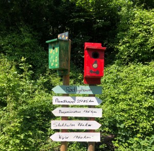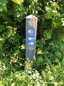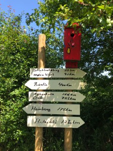 Immer weiter, weiter und weiter, immer Schnur geradeaus führt der Weg auch nach der kleinsten Biegung. Immer wieder gerade aus, rechts und links Hecken dazwischen Felder. Kaum Abwechslung für die Augen außer diese beiden hübschen Wegweiser.